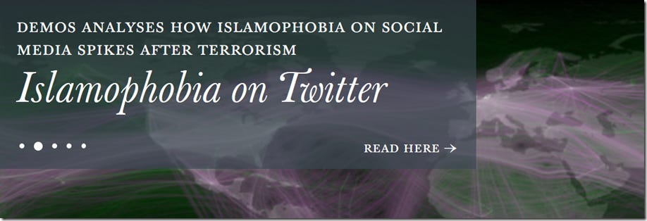 Demos is being foolish in including such a vague concept in their methodology. Under their methodology a Pakistani ex-Muslim living in fear for their life who tweeted in English (for instance) "Islam is oppressive" would be labelled an 'Islamophobe'.