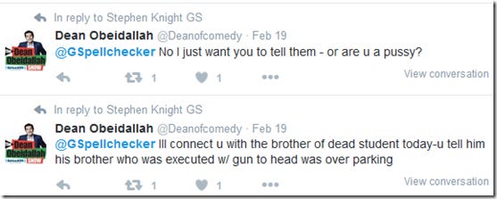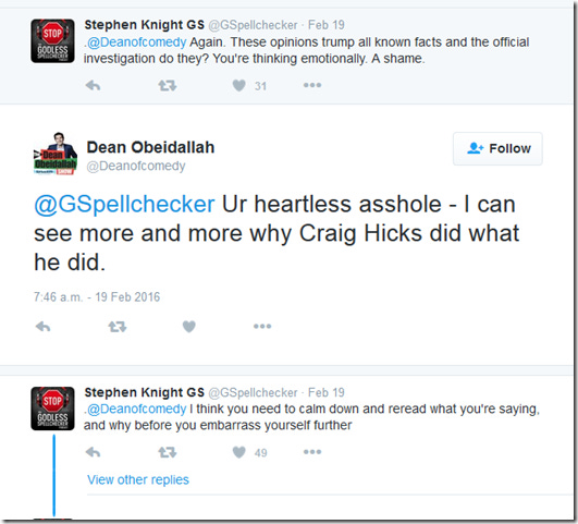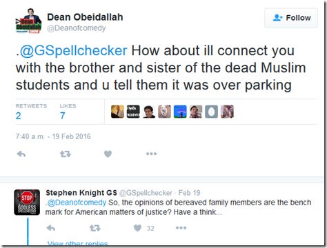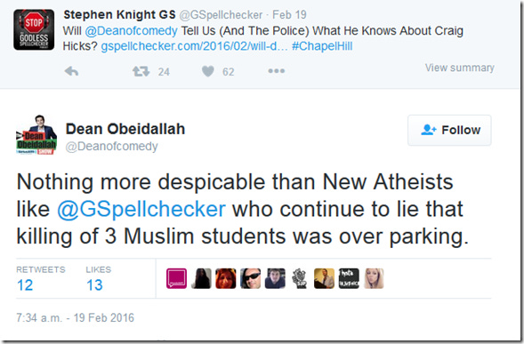 Rather than attempt to offer any evidence for his views, Dean refers to me as ‘despicable’ and accuses me of being a liar, specifically for saying this was about a ‘parking dispute’. But what Dean fails to notice however, is that I didn’t actually say it was about a ‘parking dispute’ in my article, I quoted an official statement from the Chapel Hill Police Department saying that. So, Dean is in fact calling the Chapel Hill Police Department ‘liars’. Dean should reveal what he knows that justifies this very serious smear.