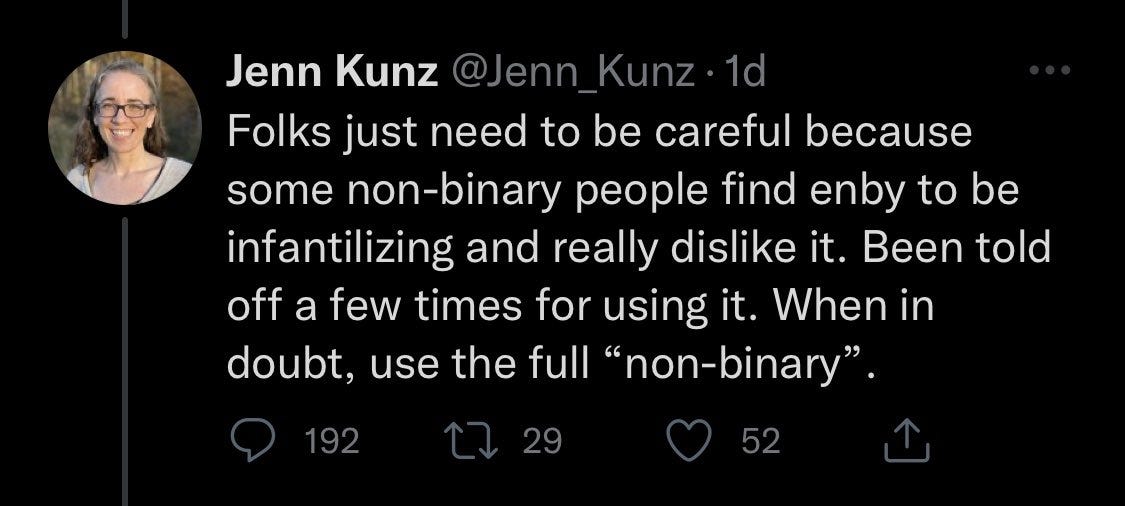 Also, I really hope Jameela thinks hard about the colonial structures she is upholding by appropriating the letters ‘NB’ for ‘non-binary’ people. One resident of Wokington tried to provide Jameela with a teaching moment: