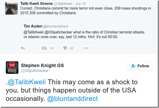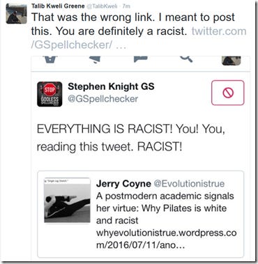 It's amusing that Kweli would dig out my tweet mocking the cheapening of the word 'racist' and use it to tell me I'm racist. You can listen to my discussion with Maajid Nawaz on anti-extremism and Islamic reform below. Stephen Knight is host of The #GSPodcast. You can listen to The Godless Spellchecker Podcast here, and support it by becoming a patron here.