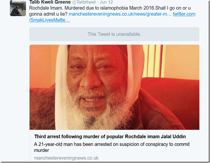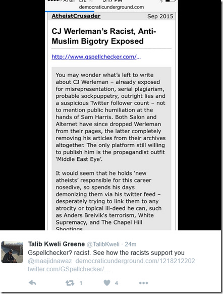 Talib doesn’t care about Muslims, as demonstrated by his absolute disdain towards Nawaz. He simply wants people to think he cares about Muslims. I doubt the countless Muslims suffering under Islamist fascism would be impressed with his virtue signals. UPDATE Aug 20 2016 After reading this blog, it appears Talib Kweli, in a desperate attempt to denigrate me further must have typed something like ‘Godless Spellchecker Muslim Bigotry’ into Google. The below result was enough for him to once again call me ‘racist’ to his one million followers: