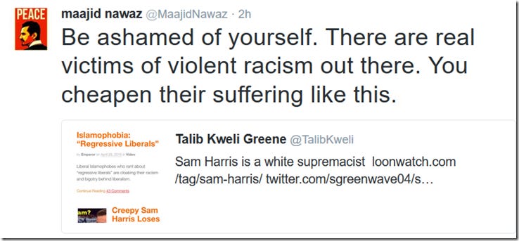 Anyone who follows the work of Sam Harris will know he is friends with Maajid Nawaz and collaborated on a book with him about Islamic reform. Oh, and isn’t a white supremacist. Nawaz, upon seeing his collaborator and friend denigrated as a 'white supremacist' by Kweli, sent the following tweet: