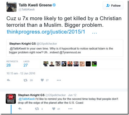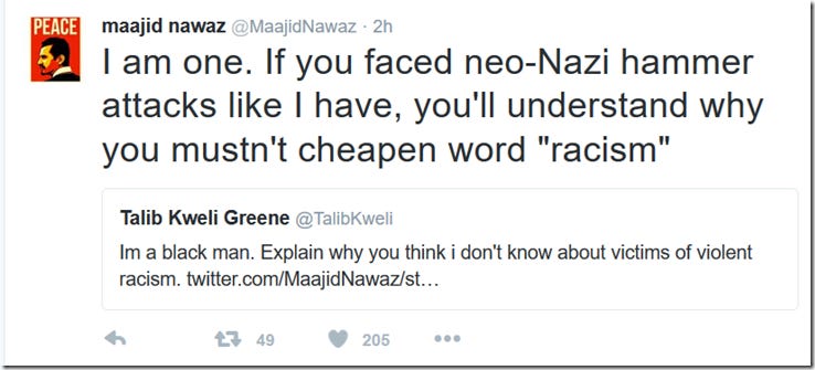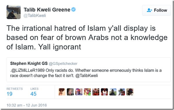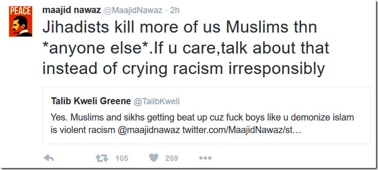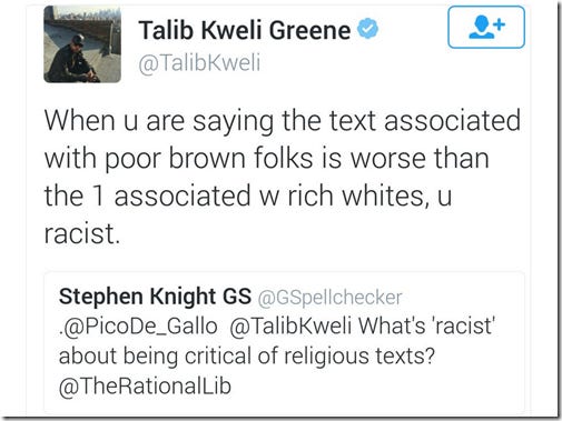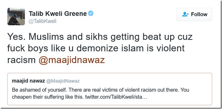 Keep in mind, Nawaz is a Muslim who is a staunch opponent of Islamic extremism and spends his time championing human rights and secularism for all. The fact that doing so in 2016’s London from within the Muslim community carries such risks demonstrates that the problem is worse than most care to understand. Upon reading this, I figured that if Maajid and his fellow Quilliam associates can make theocrats this upset, then they must be doing something right. As a result, I decided to double my monthly contribution to Quilliam. I would urge you to consider supporting Quilliam here. From far right extremists on the streets of London one moment, to far left regressives on Twitter the next. I’d never heard of Talib Kweli until I crossed paths with him on Twitter a few months back, but he’s a famous American rapper apparently. And utterly clueless. His greatest hits include: Patronising Muslims as ‘poor brown people’ and generalising them as ‘Arabs’