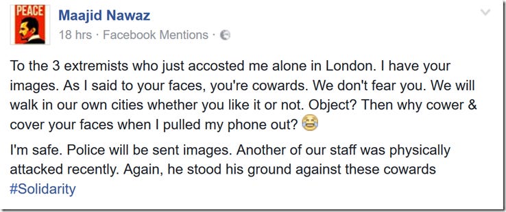 It’s been an interesting day or two for Maajid Nawaz of the anti-extremism think tank Quilliam. We learned via Nawaz’s Facebook page that he’d had a run in with a number of Islamist thugs in London: