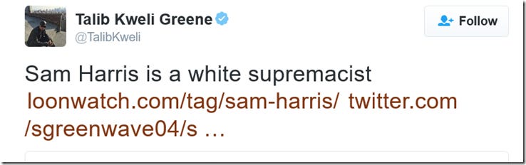 Anyone who doesn’t agree with Talib’s take on things is automatically branded a ‘white supremacist’ to his one million strong Twitter audience. Author Michael Sherlock has documented his experience of this on his website. This is a man who was raised in an affluent area of New York to a professor of law mother and University administrator father. He enjoyed the privilege of an expensive education and now earns millions rapping, yet preaches about ‘white privilege’ to any white detractor on Twitter. This brings me to today’s shenanigans. Given I’m an ignorant, privileged, white non-Muslim who has no business opining on these issues, just how keen is Kweli to listen to those ‘poor brown’ Muslims he’s so concerned for? Well, not very it seems. Talib was engaging in his favourite pastime of pin the tail on the white supremacist, this time taking aim at Sam Harris:
