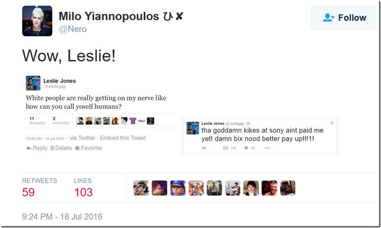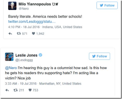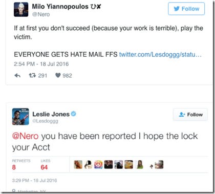 It seems after a succession of suspensions, conservative commentator Milo Yiannopoulos has been permanently banned from Twitter. I’m probably a million miles away from Milo Yiannopoulos’s politics and rhetoric. He’s not actually someone whose output I follow or go out of my way to keep an eye on. His chosen role of provocateur has amused me on occasion but has also had me scratching my head on others. However, that’s irrelevant given free speech is also there for the opinions of people you don’t agree with. In fact, it can never truly be ‘free’ otherwise. In the wake of the release of the Ghostbusters reboot this week, its star Leslie Jones has been making the headlines for some disappointing reasons. According to reports, she has received a large amount of online abuse since the movie hit cinema screens – some of which was racist. This has unfortunately led to her calling time on her Twitter experience. I’ll always be against abuse and harassment on social media (or anywhere) and I think the people responsible for it should be held accountable. However, too often I find the line between robust criticism and outright abuse is intentionally blurred by ‘professional victims’ who wish to detract from the issues at hand. In this case, Leslie did receive the horrible abuse she claimed to have received of course, but I also think there has been some unhelpful line blurring taking place too where Milo's involvement is concerned. Now, unless I’ve missed something, or the reporting on this has been incredibly selective (see UPDATE below), Milo appears to be guilty only of criticising Leslie Jones. Below is the exchange that appears to have got him pinched by the Twitter police:
