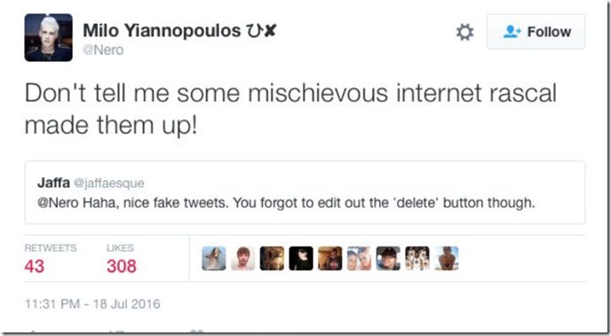 Now, I appreciate I’m entering dodgy territory by using screenshots that I can’t directly authenticate to make a point about using doctored screenshots, but I’ve had enough independent corroboration for me to conclude that Milo did indeed amplify these fake tweets in Leslie Jones's name. You can also see them archived here. And below, we have Milo seemingly implying he is behind them.
