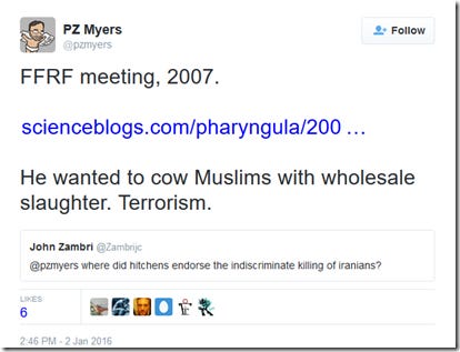 Now, I’m not sure why the question about Iranians is being asked here. The tweet that ‘John Zambri’ is replying to has either been deleted or was never there in the first place. If it’s the latter, it would seem rather odd for PZ Myers to respond to the challenge with a location, time and link though. The included link is PZ Myers’s own report of the FFRF meeting in 2007 - which he and Christopher Hitchens attended as speaking guests. Myers notes his dissatisfaction with Hitchens singling out ‘Islam’ during his talk, then claims this of the Q&A section (emphasis mine):
