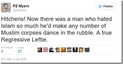 ‘Any number’ of al-Qaeda members would have been more accurate in Myers’s initial tweet. Call Hitchens’s comments hawkish, call them wrongheaded, call them whatever you like. But just don’t try to claim he was ‘proposing genocide’ or advocating ‘wholesale execution of the population of the Moslem world’. That would make you a PZ Liars.
