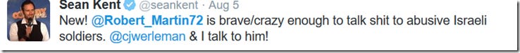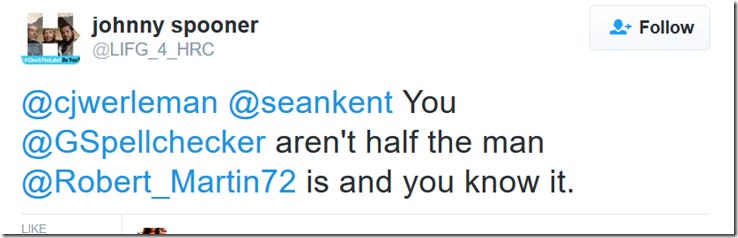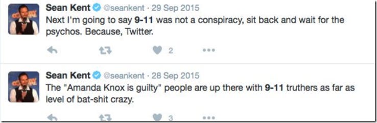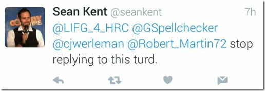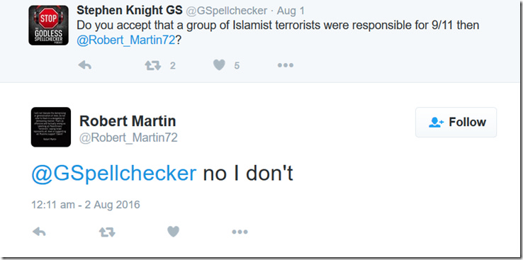 Seems rather unambiguous to me. Once it was revealed to Sean that his guest appeared to be a 9/11 ‘truther’ he responded not by denouncing Robert Martin as ‘bat-shit crazy’ or a ‘psycho’, but by labelling me a ‘turd’ for highlighting this fact. Then he also blocked.